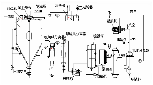首先在干燥塔體內充入被加熱的氮氣,被干燥的液態物料經輸液泵輸送至噴頭處,液態物料被霧化器霧化成細小液滴,液滴在干燥塔內與熱氮氣進行充分的熱交換,物料中的液態部分被瞬間蒸發,固態部分形成的粉狀物料沉于塔底,干燥的粉狀物料從塔底排出。其中,被蒸發的有機溶劑氣體在風機的作用下,通過旋風分離器、噴淋塔等裝置把附著在氣體中的粉塵進行除塵處理,再經冷凝器把除塵后飽和有機溶劑氣體冷凝成液體排出冷凝器。其間,作為干燥介質的惰性氣體被連續加熱后作為干燥載體在系統內重新循環使用。